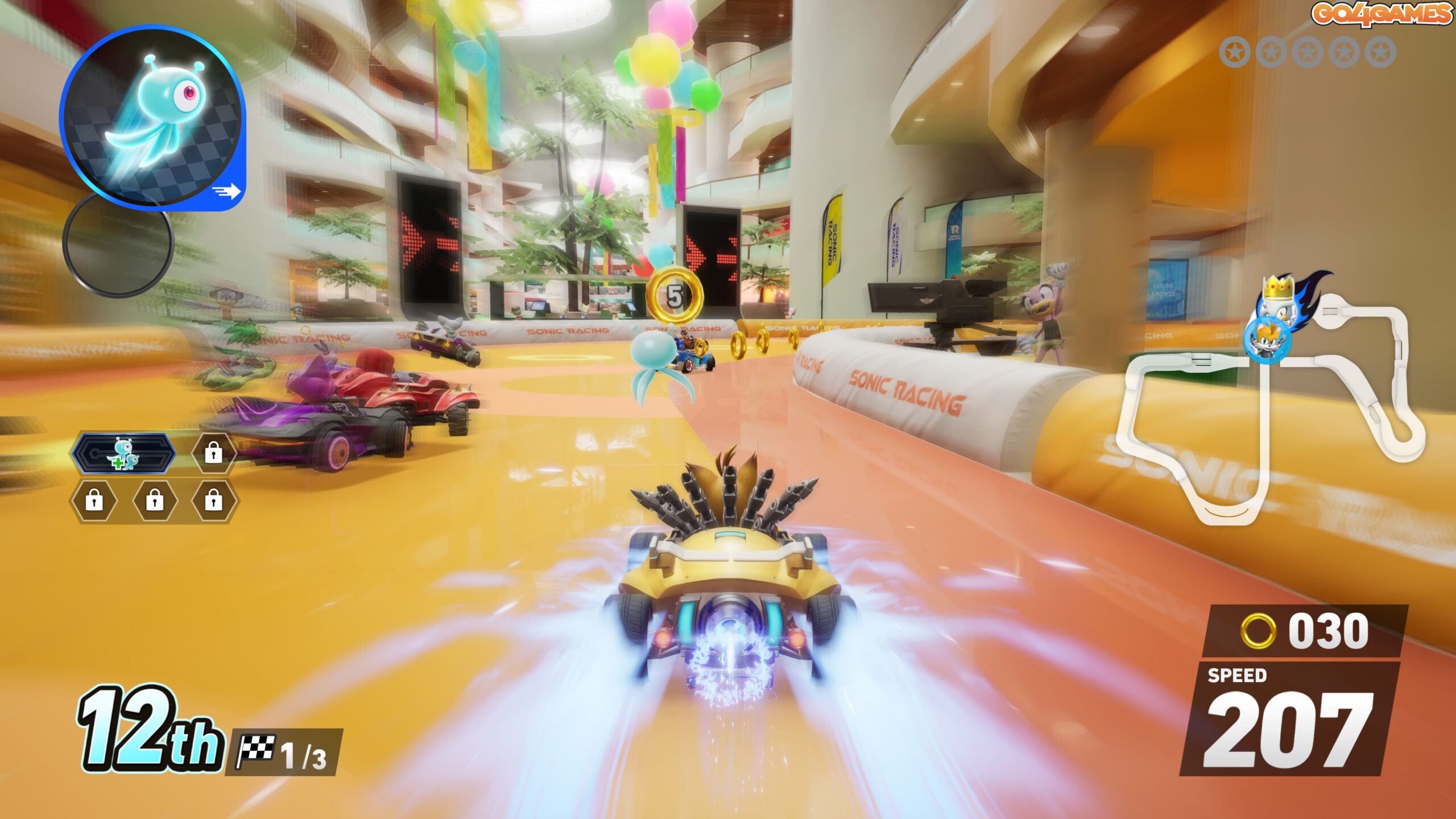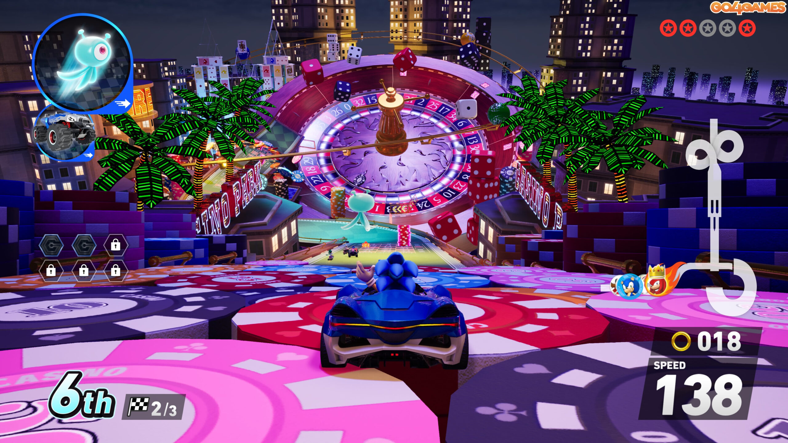 Da, ai citit bine. Există o pistă proiectată la fundul lui Bikini Bottom, cu corali fluorescenți și un Patrick care ține pancarte cu „Go, Sonic!”. Dar, dacă acest mix inedit nu este destul de sărit de pe fix pentru voi, țin să vă anunț că mai vine și Mega Man ca DLC, cu tot cu temă muzicală retro și mașinuță cu pixel shader. Este pură nebunie, dar o nebunie controlată, exact cât trebuie ca să te simți din nou copil.