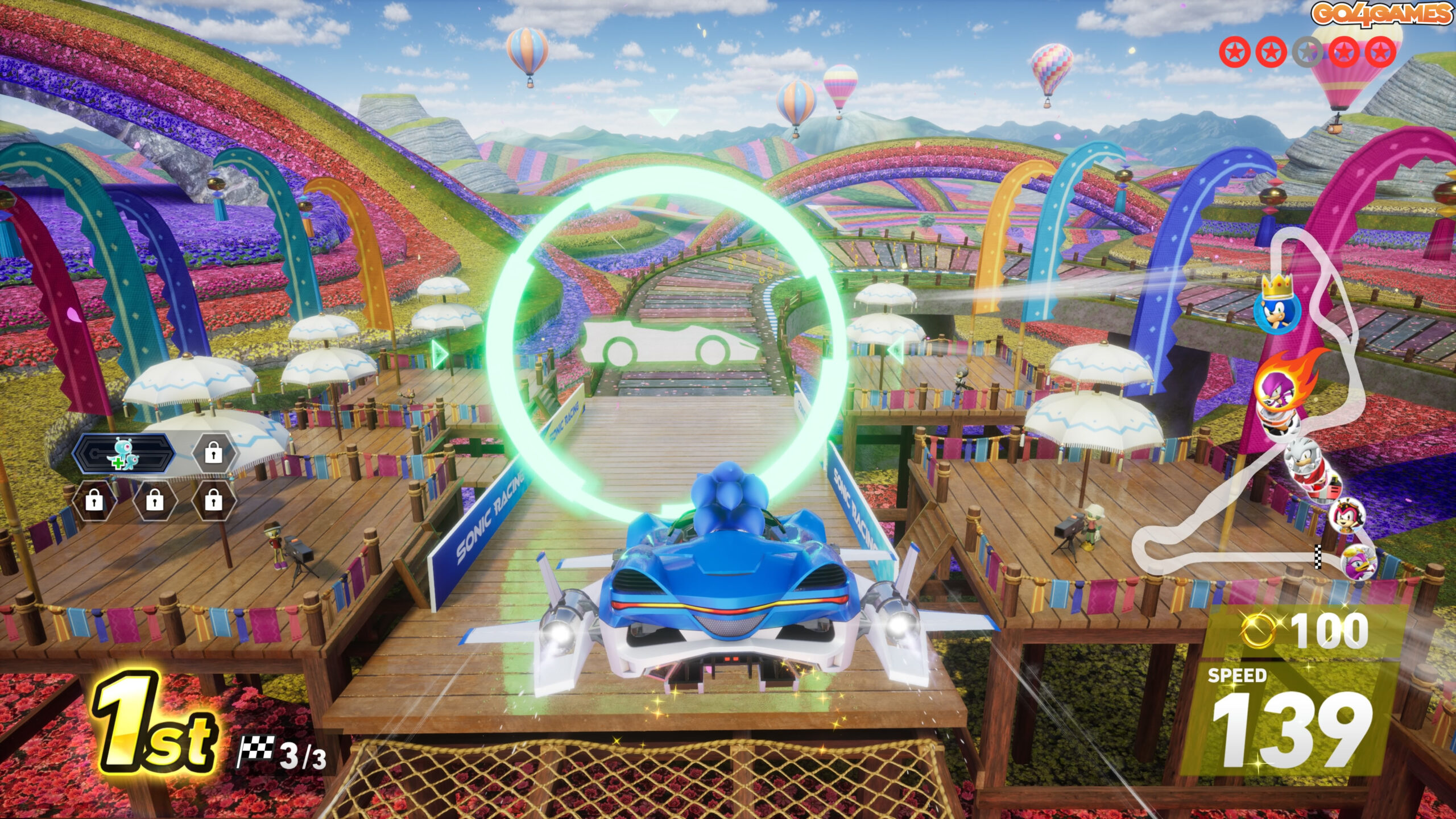 Dar marele șmecherlâc al jocului (așa-numitul „gimmick”, cum ar zice japonezul cu accent londonez) constă în faptul că fiecare cursă se desfășoară în mai multe lumi succesive. Adică pornești din Green Hill, dar în al doilea tur ești deja pe o mare agitată, iar în al treilea zbori printre nori și inele plutitoare. Toate astea fără să ieși din cursă. Este ca și cum ai juca trei Mario Kart-uri în același timp, dar fără pericolul de a-ți exploda procesorul.
