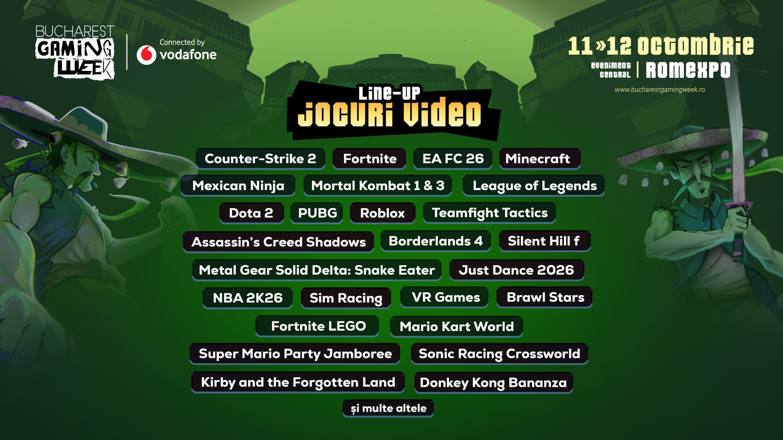 De-a lungul celor două zile, publicul își va putea demonstra skill-urile în Counter-Strike 2, Fortnite, Minecraft, Mortal Kombat, EA SPORTS FC 26, Roblox, PUBG Mobile, LEGO Fortnite, Mario Kart și jocuri de sim racing. Cei de la Nintendo au pregătit surprize și sesiuni demo pentru cele mai noi titluri de pe Nintendo Switch 2, printre care Mario Kart World, Donkey Kong Bananza, Kirby și The Forgotten Land. La standul Amber, vizitatorii pot testa în premieră demo-ul Mexican Ninja, noul joc al studioului românesc aflat în producție. Jucătorii intră în rolul unui ninja mexican care își croiește drumul printr-o lume intensă și plină de provocări. Cei care avansează în joc pot câștiga controllere și alte periferice de gaming.
