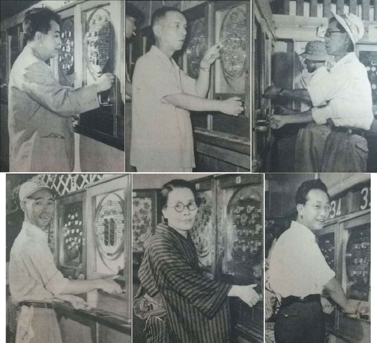 Jiro Arita (politician, om de afaceri), Ashinoya Gangyoku (actor, comediant), Fujiura Ko (poet, compozitor), Hiroshi Miyazaki (compozitor), Otani Fujiko (scriitoare, critic literar), Yoshida Ken’ichi (scriitor, critic literar) jucând Pachinko in 1951