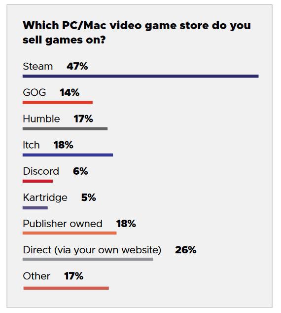 În randurile celor care îşi comercializează jocurile pe PC, Steam rămâne cel mai popular sistem de distribuţie digitală, cu 47% dintre votorile intervievaţilor, în ciuda “asaltului” celor de la Epic Games cu noul lor Epic Games Store (care nici măcar nu este listat individual în preferinţele participanţilor la acest sondaj). Cu toate acestea, mai mult de jumatate dintre aceştia nu cred că facilităţile oferite de Steam justifică cota de 30% din încasări pe care Valve o pretinde pentru fiecare joc comercializat prin intermediul sistemului său.