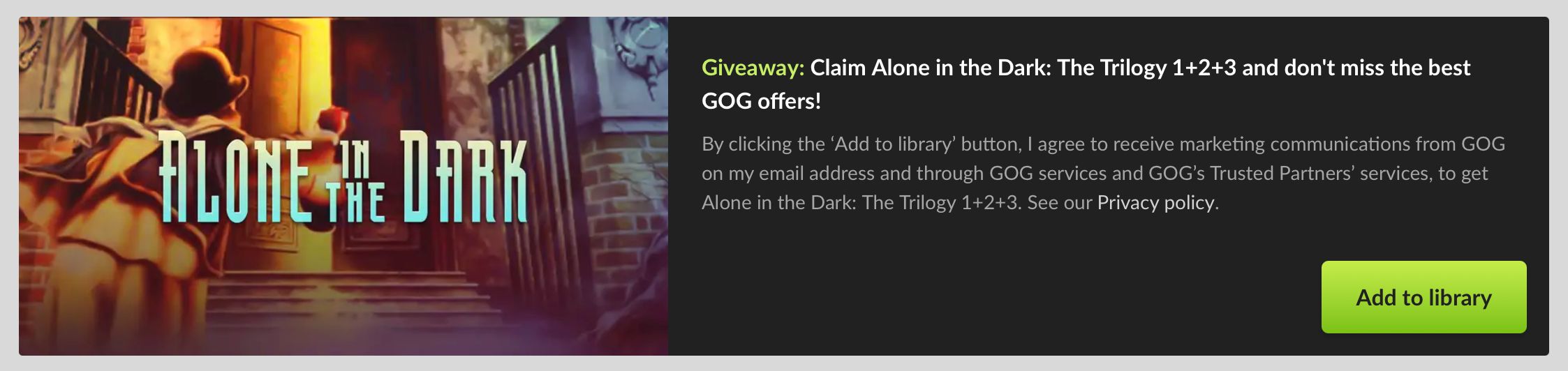 Cu ocazia acestei campanii, GOG oferă încă un pachet de jocuri gratuite – trilogia originală Alone in The Dark –, pe care îl puteți obține accesând gog.com, abonându-vă la newsletter-ul celor de la GOG și selectând banner-ul reprodus în imaginea de mai jos.