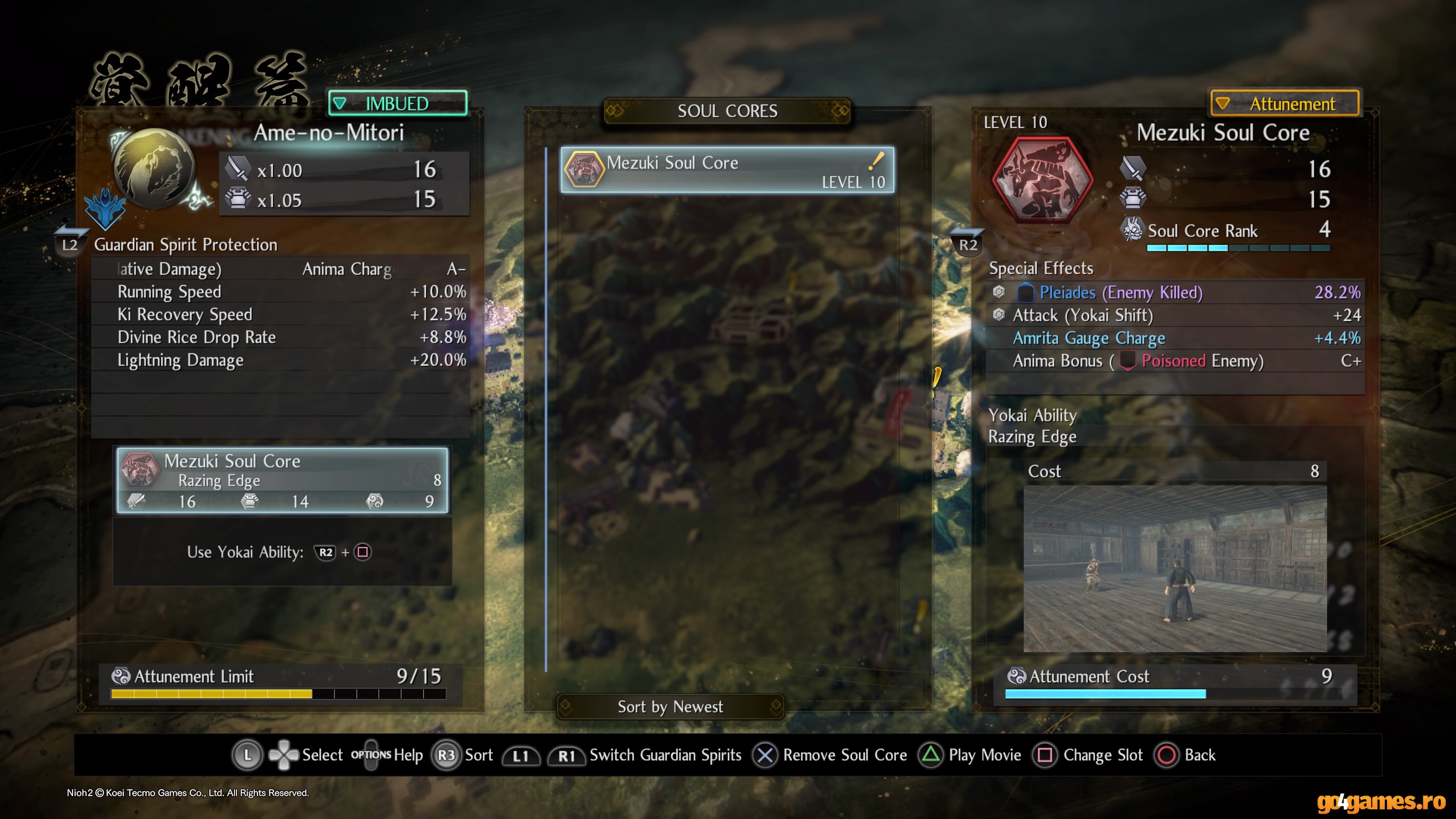 Când un yokai este ucis, acesta poate lăsa în urma sa un soul core. Soul cores trebuie aduse la altar, unde vor fi automat purificate. Guardian spirit-ul poate ţine două astfel de spirit cores, apoi trei spirit cores (al treilea slot se deblochează spre finalul poveştii), iar jucătorul poate folosi bara de energie yokai pentru a executa un atac similar cu cel al inamicului ucis. Soul cores îmbunătăţesc şi bonusurile oferite de guardian spirit, au propriul nivel şi propriile bonusuri, pot fi combinate pentru a le creşte nivelul sau pot fi eliminate din inventar. Dacă personajul moare după ce adunase unul sau mai multe soul cores, acestea pot fi recuperate, împreună cu amrita pierdută, atingând mormântul indicat de guardian spirit.