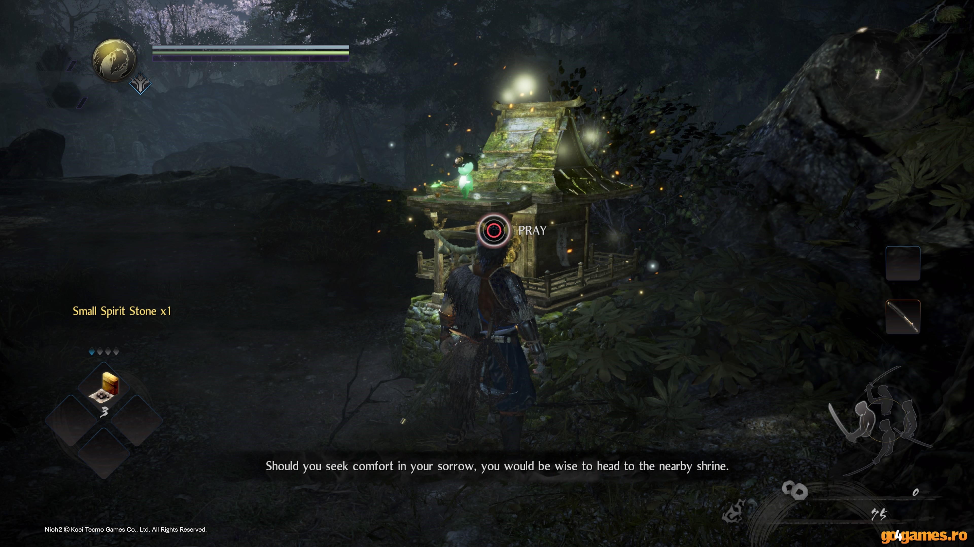 Precum alte titluri inspirate din mecanicile consacrate de Dark Souls, şi în Nioh 2, la punctele de pornire ale oricărei misiuni se regăseşte un altar, unde jucătorul poate creşte în nivel, îşi poate gestiona alte elemente precum guardian spirit-ul şi bonusurile de la spirite kodama, poate oferi item-uri pentru amrita sau are posibilitatea de a iniţia o sesiune co-op alături de un alt jucător. În bună tradiţie a jocurilor de acest gen, dacă interacţionezi cu un astfel de altar ţi se reface stocul de elixire, precum şi item-urile ninjutsu şi onmyo, însă majoritatea inamicilor ucişi până atunci sunt readuşi la viaţă (cu excepţia anumitor inamici mai puternici). Amrita amintită mai devreme reprezintă resursa folosită pentru a creşte nivelul eroului. Atunci când Hide moare, se crează un mormânt cu spiritul care fusese selectat, şi toţi inamicii se respawnează. Dacă jucătorul ajunge din nou în locul morţii sale precedente şi atinge mormântul, îşi poate recupera amrita pierdută. În caz contrar, dacă Hide moare înainte de a-şi atinge mormântul, amrita respectivă va fi pierdută definitiv.