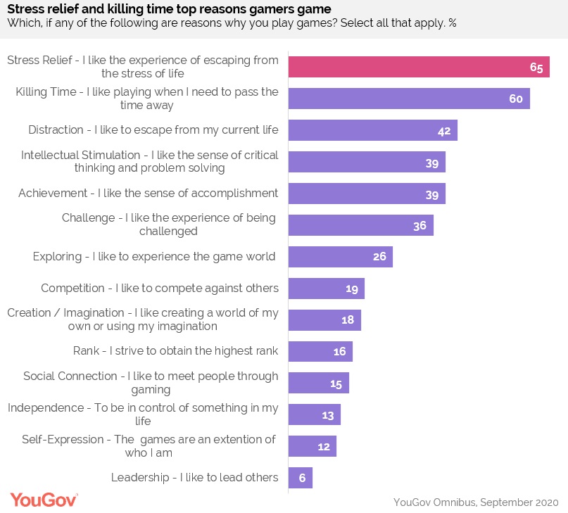 Acum trecem la lucrile suprinzătoare relevate de sondaj. Aproape două treimi dintre respondenți (65%) au spus că se refugiază în jocurile video pentru a scăpa de stres, iar 60% au spus că fac acest lucru pentru a-și „omorî timpul”. Pentru 42% dintre cei chestionați, gamingul este o modalitate de a scăpa de problemele din viața de zi cu zi.
