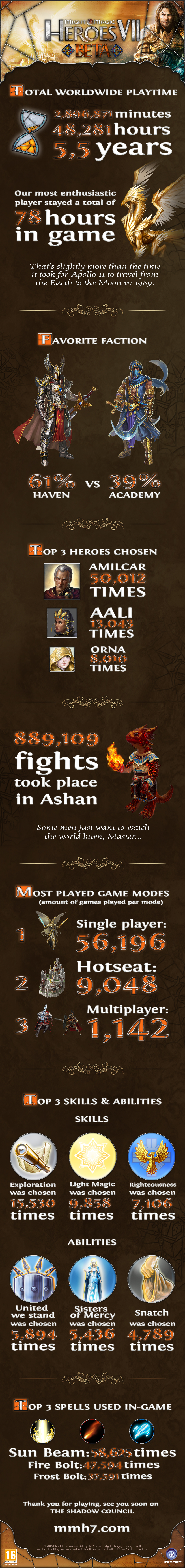 Ubisoft a anunţat încheierea cu succes a primei sesiuni de testare beta a jocului Might & Magic Heroes VII. Astfel, după primele două săptămâni în care jucătorii au avut ocazia să ia contactul cu noul joc al seriei Heroes, s-au petrecut 48 000 de ore în joc, desfăşurându-se peste 800 000 de lupte în Ashan, alături de cele două facţiuni incluse în beta: Haven şi Academy. Mai multe informaţii despre această sesiune de beta testing puteţi găsi în grafica de mai jos.